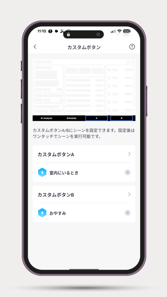 2つのカスタムボタンにSwitchBot製品の操作やシーンを割り当て、ワンタッチで家電操作が可能